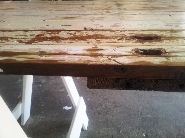 White washed rustic trestle table, cream paint; a lovely vintage look to any pop up shop or fashion event. Available with natural pine, white painted or dark rustic trestle legs.